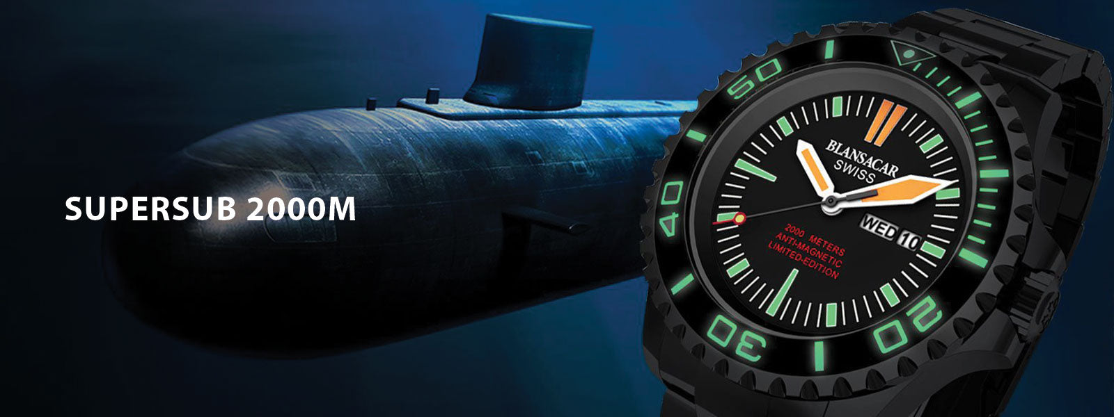 Blansacar Super Sub case has a diameter of 45mm with rotating bezel, anti-reflection sapphire crystal glass with thickness of 4mm. It also uses 316L surgical grade stainless steel material as casing to achieve better and overall corrosion resistant properties. The watch dial, hand and bezel are set with Super-LumiNova that can operate in the dark like a light battery for at least 8 hours after sufficient activation by light. The helium relief valve allows such timepiece in the helium-saturated environment as used in depths of more than 250 feet.